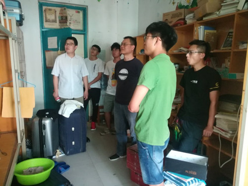 为了深入了解学生的学习生活情况、强化学生宿舍安全管理,为同学们营造一个更加文明、卫生、安全、健康的生活环境。6月13日下午4点半,党总支副书记陈永刚、团总之书记王玉香以及辅导员胡可鑫、王元杰、尚津、杨奇奇、王雪冰、刘阳等老师对我院学生宿舍进行了随机走访。