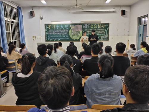在同学们的翘首期盼中团课终于拉开帷幕,首先由各班级的主持人向同学们介绍十九届四中全会的背景和内容,让同学们了解本次团课的目的。接着,由各班的演讲人分别进行演讲。在他们洪亮有力的声音中,我们可以体会到国家对传播十九届四中全会精神的重视。新中国成立至今,中国已迈着稳健的步伐踏进了新时代,当代青年人已然处于时代的潮流,“吾辈当不负先辈之努力”,我们要把自己的梦想与中国紧密相连,继往开来,与祖国共奋进!活动中,同学们认真聆听、积极回答主持人的问题,并表示要努力学习党的思想、紧跟党的步伐,保持自信之心、激荡自信之力、走好自信之途!