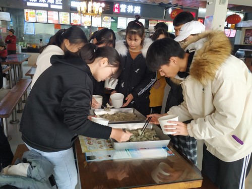 活动伊始,我院社实部同学与信息工程学院的同学们在红色花蕊处交接并一同前往学校餐厅准备食材,同学们购买了肉、素两种饺子馅和一大兜面皮。随后进入包饺子环节,为了提高包饺子的效率使宿管叔叔阿姨们准时在饭点吃到饺子,大家进行分工合作,两个院各分两组,素馅和肉馅各一组。大家发挥自己的想象力包出了各种各样的饺子,现场欢声笑语,时间也在包饺子的过程中慢慢流逝,一个小时过后,一盆盆热气腾腾的饺子端上桌。面对刚出锅的饺子,同学们并没有选择先尝尝自己的手艺,而是赶忙将饺子打包装入保温饭盒给宿管叔叔、阿姨们送去,感谢他们一直以来的辛苦工作与付出。叔叔阿姨们收到同学们的水饺之后对其行为表示感谢,并感受到了寒冬中的爱与温暖,希望同学们能够持之以恒的开展公益活动,给更广大的人群送去关爱。最后,同学们满心欢喜的回到餐厅将剩余的饺子吃完,他们尝到自己亲手包的饺子脸上洋溢着幸福的微笑。此次活动圆满结束。