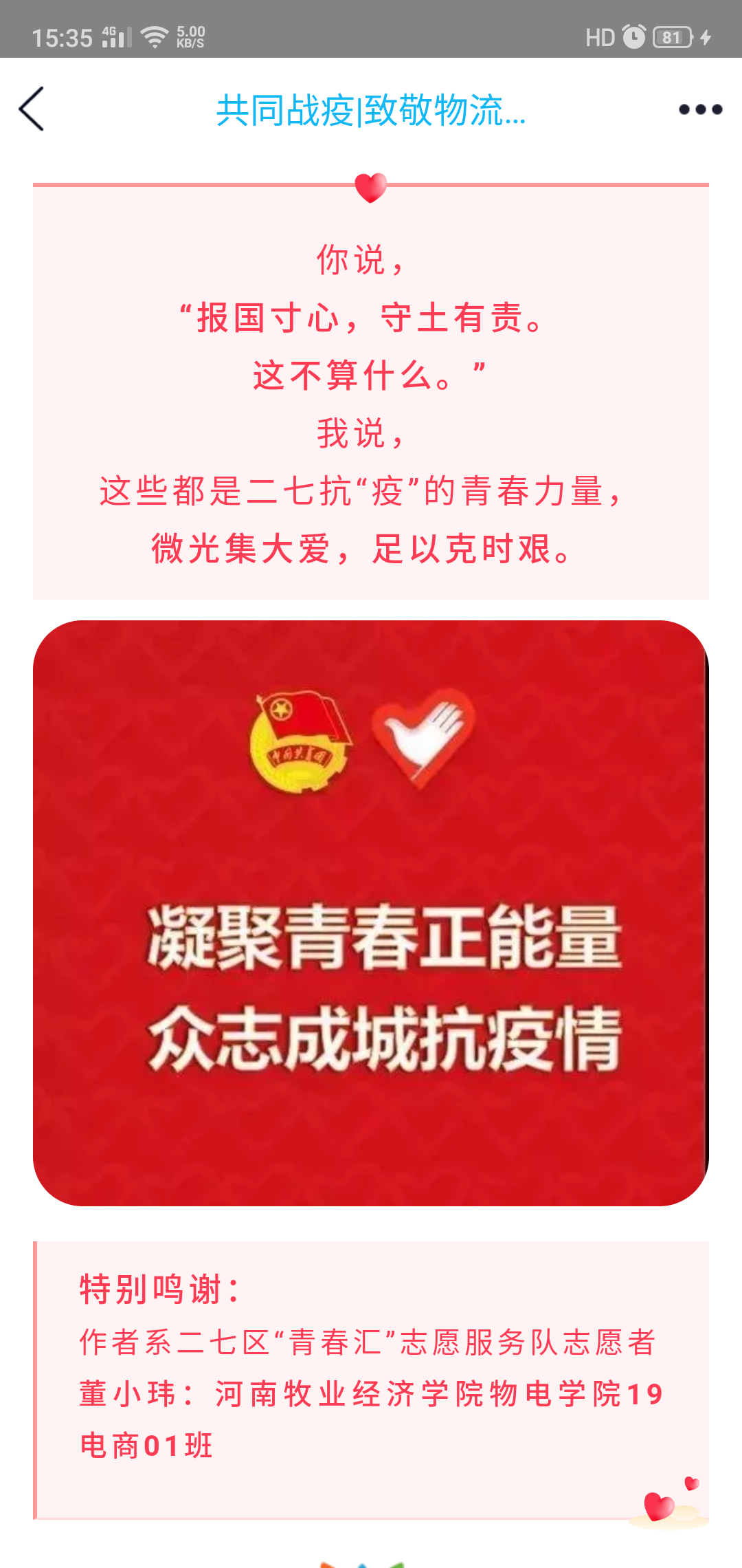 疫情当前,我院上下齐心共同战疫,学子们为疫奉献的壮举,不仅展现了当代大学生的担当和作为,而且赢得好评为学院争光。