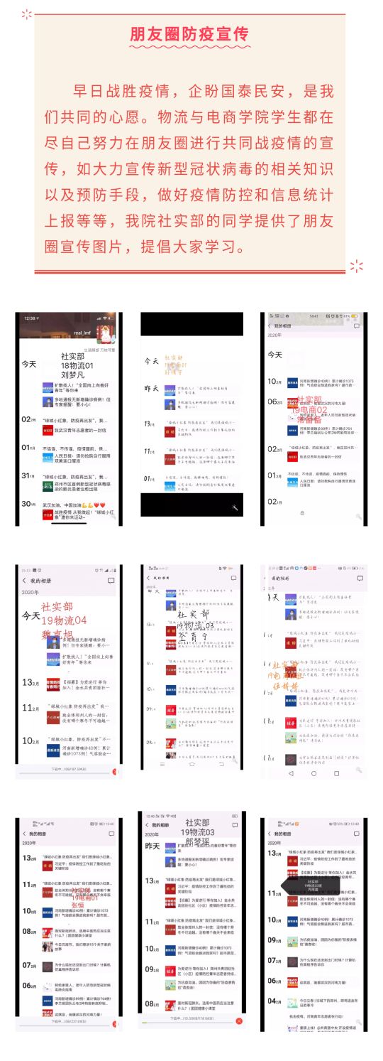 防疫你我他,宣传不可缺。习近平总书记强调:生命重于泰山,疫情就是命令,防控就是责任。我院社会实践部的同学们将习近平总书记的教诲牢记于心,他们勇于担当,把责任扛在肩上。他们在朋友圈大力宣传新型冠状病毒的相关知识以及预防手段,并进行疫情防控的信息统计和上报。他们的行为不仅提高了人们的防疫意识,还带动大家纷纷转发,获得了人们的肯定和赞扬。