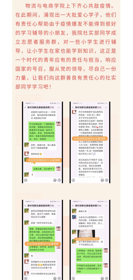 停课不停学,辅导我先行。受疫情影响,教育部下发通知:全国各地中小学延期开学,并开展线上教育。线上教育虽然资源优质却存在辅导不足的问题,为响应教育部通知,帮助小学生在线答疑,我院社会实践部联合杲村党群服务中心成立社区志愿者服务群,在学习之余在线为小学生辅导功课。他们在进行辅导的同时还向小学生普及疫情防控、辟谣等方面的知识。
