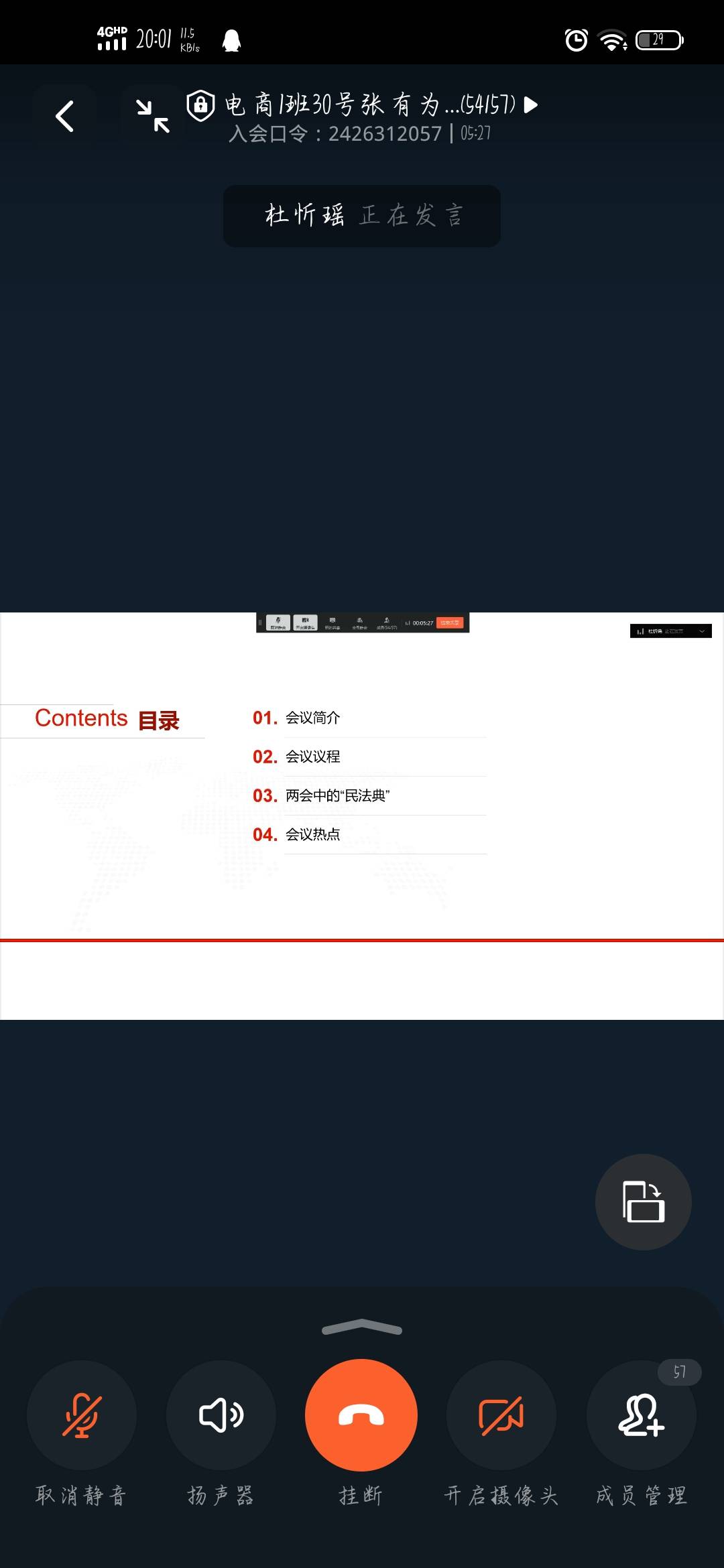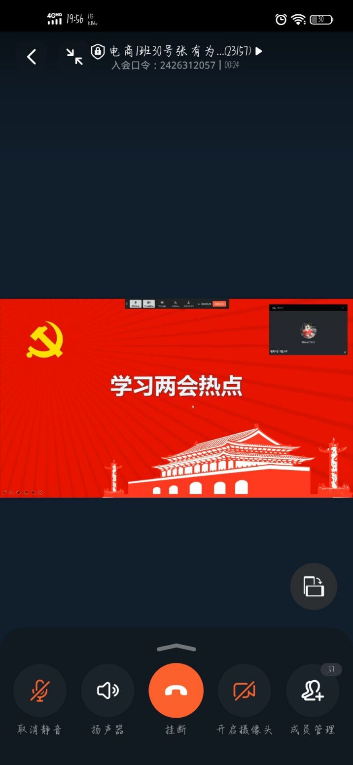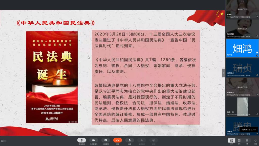 本次活动借助钉钉平台以视频会议的形式开展,在会议开始之前,各班的驻班党员们已提前完成了PPT和其它相关材料的准备,在各班同学准时参会之后,驻班党员开始以PPT的形式向同学们详细讲解两会和两会精神。在互动的环节中,同学们和驻班党员们一起讨论两会内容,重点讨论了民法典和摆摊经济。大家认为民法典是国家治理和社会治理的基本遵循,是涉及国计民生极为重要的法典。而摆摊经济,其实就是顺民心的一种经济。通过同学们的发言和表述,可以了解到同学们对于两会的内容已经有很深的认识。最后,在驻班党员们表达完他们对于两会的心得体会之后,本次会议圆满结束。