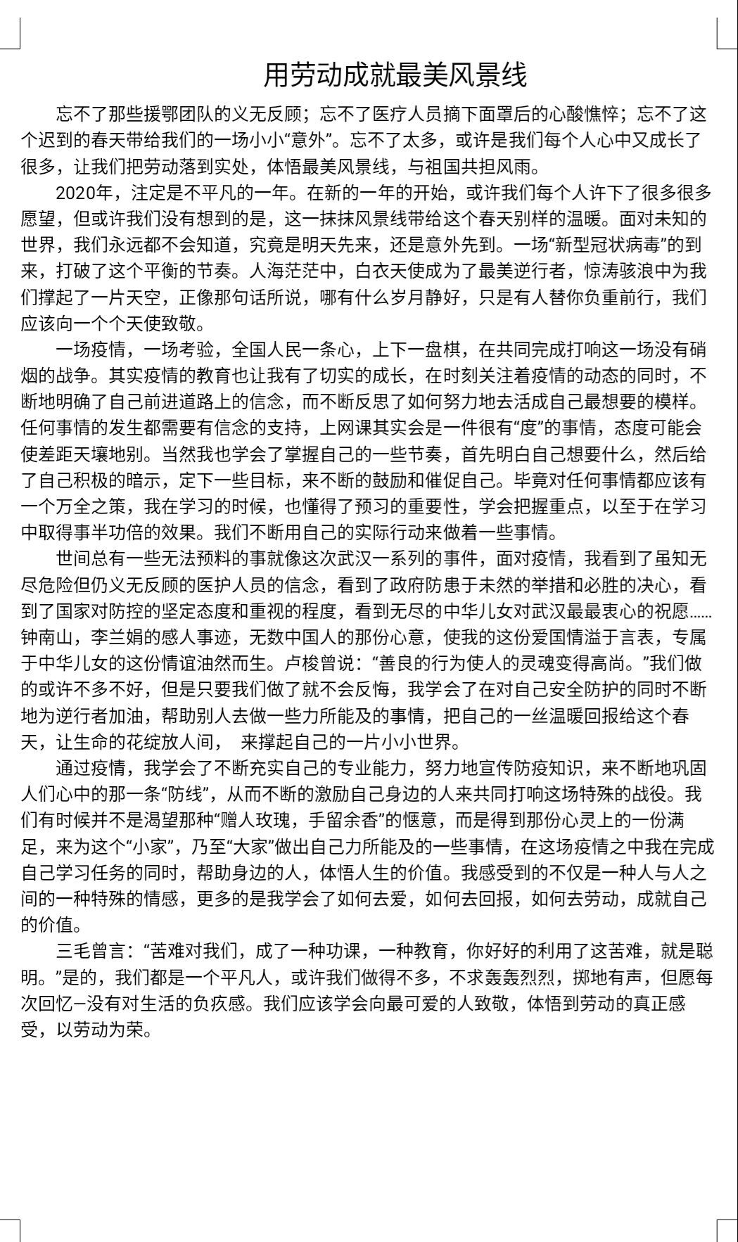 为弘扬劳动精神、抗疫精神,积极营造“劳动最光荣”的良好风尚,培养同学们正确的劳动价值观和良好的劳动品质,鼓励同学们自觉践行社会主义核心价值观。williamhill英国积极响应学校号召,于6月23至30日组织开展“劳动的青春最美丽”主题征文活动,引导学生们以文章的形式表达学习《关于全面加强新时代大中小学生劳动教育的意见》的心得体会,学习抗疫精神的感受以及分享假期生活的感悟。