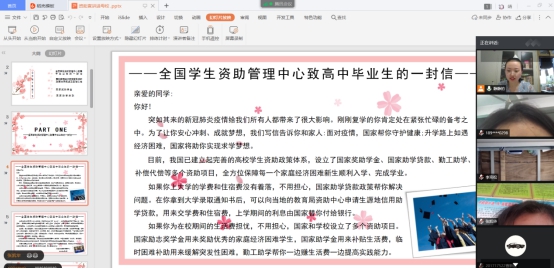 2020年8月,受疫情影响,我院国家奖学金获得者赵雪格,肖靖,学生资助宣传大使朱琳,李佳楠,张伊晓,彭诗佳,李雪璐根据自己身边的高中生对学弟学妹们进行资助云宣讲,她们积极利用钉钉,腾讯会议,微信等通讯工具给自己周围的高中生进行资助政策云宣讲,并派发了《资助中心给予高中毕业生的一封信》。