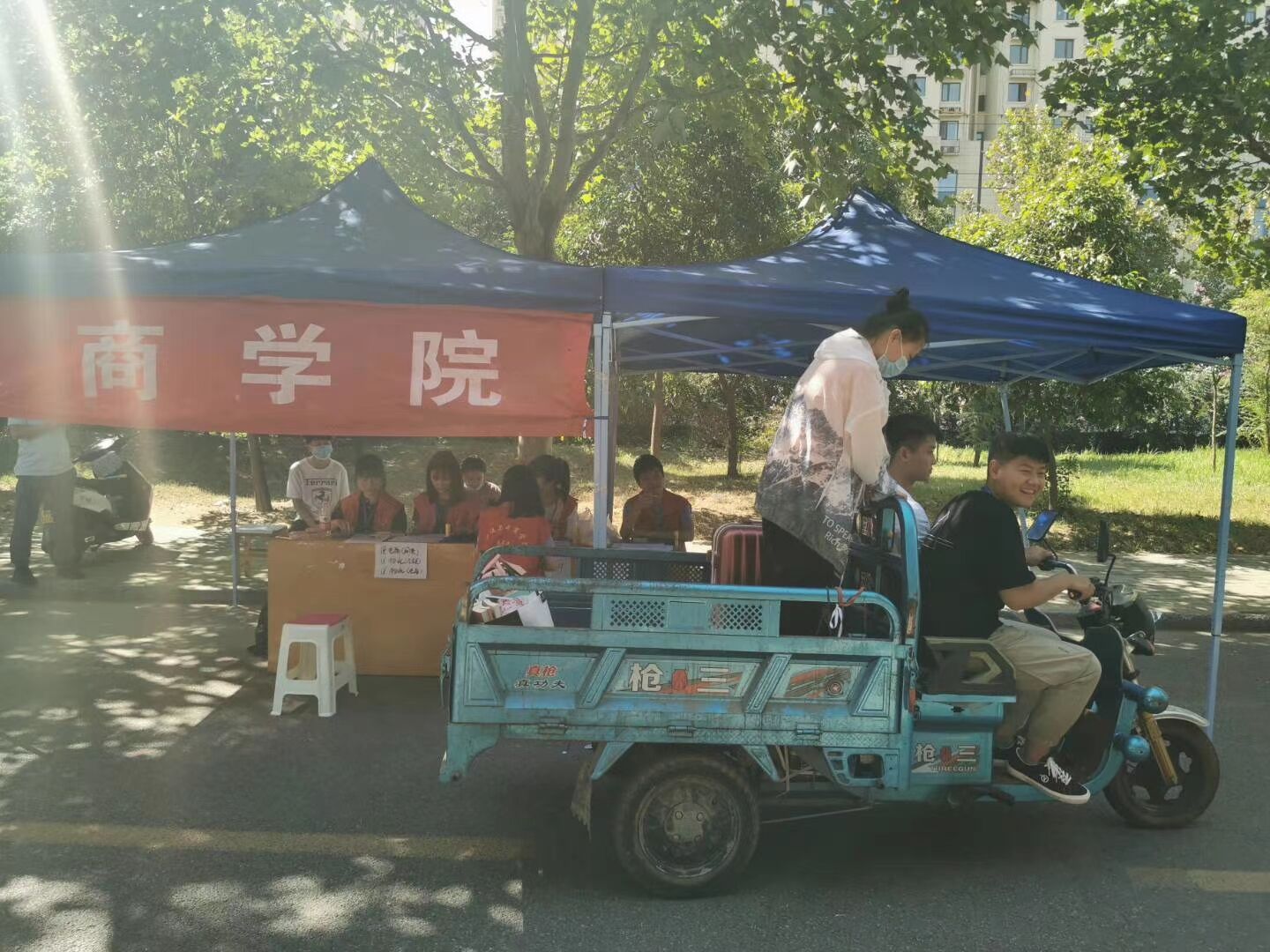 2020年上半年大家一起在家攻克艰难,9月终于迎来我校的开学季,为了学生们在9月4日、5日、6日能顺利安全地入校,我院的各位老师准备了几个星期,开学第一天就在林荫路边支起帐篷为大家办理各项报到的手续,认真消毒。半年未归,同学们也热情未减。我院19级的许多同学都报名参加了以我院团学会社实部为首的“志愿者服务队”,协助老师们完成返校工作,帮大家拎拿行李。