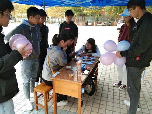 我院心教部成员在红色花蕊处开设活动点,给参与的同学提供气球、彩笔、打气筒等活动工具,同学们可以在气球上书写、涂画,将生活压力书写出来,亦或是记下对未来生活的期望与希冀。最后同学们集体将写有消极情绪的气球踩破,以表示对过去不良情绪的抛弃,进而以更好的心态迎接新的生活。