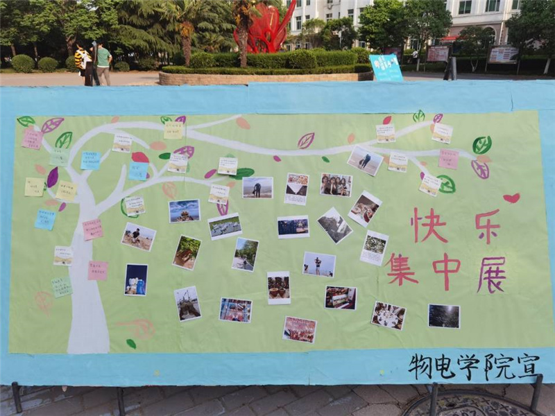 活动开始前,心教部人员在院团委QQ空间进行宣传,并且积极与各班心理委员进行沟通交流,将通知下达到各班。同学们积极主动参与,分享在假期及生活中的趣事,并且在这期间有幸邀请到王雪冰书记参与本次活动,王书记的支持更是得到了我院学生的积极响应。活动后期,我部人员共收取到110份作品,收集的作品中大部分是同学们记录五一假期中的快乐时光,通过这些作品,感受到了同学们日常生活中的乐趣以及认真生活的态度。随后,心教部人员将收集到的作品进行认真评选,共筛选出了25份优秀作品,最后由心教部人员将照片打印出来,粘贴展示在红色花蕊处的展板上以供同学们欣赏,鼓励同学们在学习之外,要合理安排空余时间,享受生活,愉悦身心,推动我院学生健康发展。