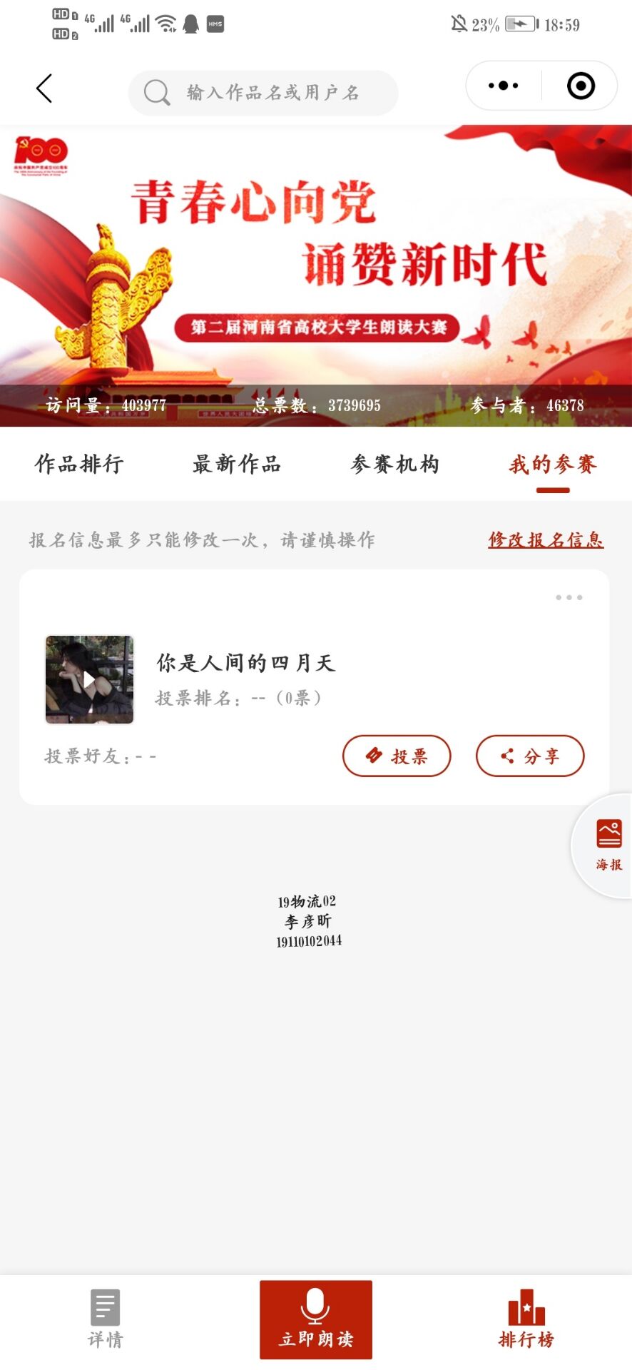 5月10日文艺部接到校级活动“青春心向党•诵赞新时代”朗诵大赛活动在我院征集作品的通知,之后文艺部成员下发通知向19、20级各班征集参赛作品,并且要求主持朗诵队成员及新加入团学会的同学必须参加此次活动。本次活动以提交所录制的音频进行比赛,要求作品内容积极向上,符合活动主题。5月10日-5月15征集活动作品期间各班同学积极参赛并及时提交作品。