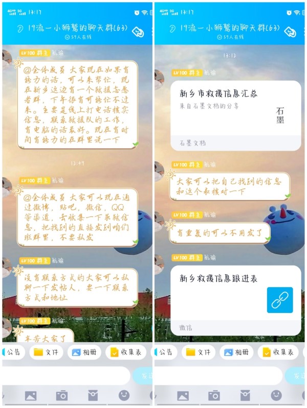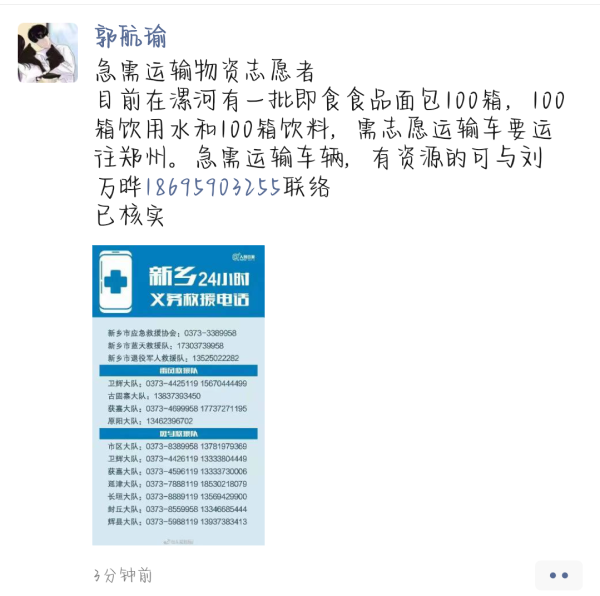 据郭航瑜同学回忆,21日晚上9时左右,新乡市光彩市场附近因暴雨积水突涨,郭航瑜同学响应业主群号召积极前往积水市场,在商户门前垒沙袋防止积水漫入,并将不能碰水的货物进行转移。郭航瑜同学说自愿帮忙的人很多,很快就完成。不止如此,作为班长,加入了新乡救援群的郭航瑜同学积极动员班上学生收集相关求援信息,参与救灾工作。他组织班上同学通过微信、微博、QQ、贴吧等搜集求救信息,一一联系发帖人,跟进救援工作。
