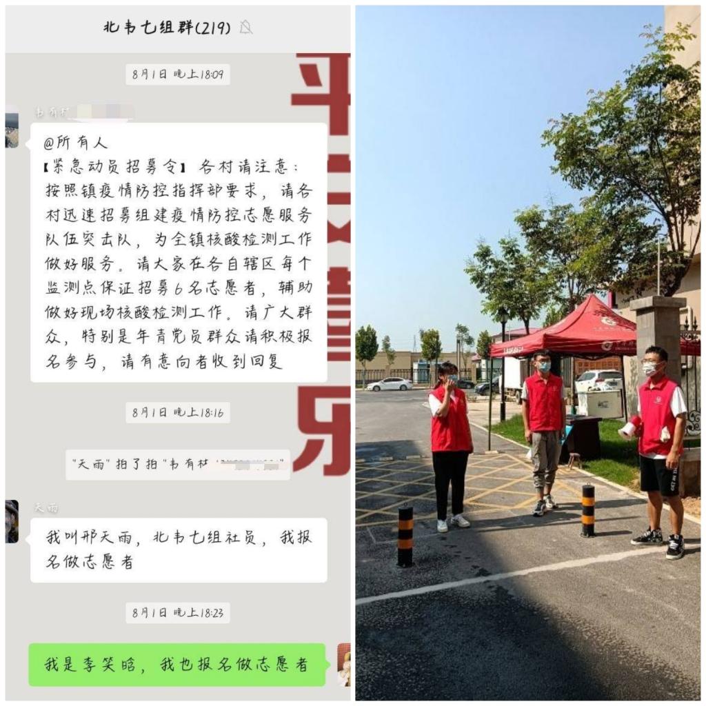我院18级物流(电商)1班的李笑晗同学,在河南省郑州市中牟县狼城岗镇北韦村参加抗疫。据李笑晗同学回忆,8月1日晚上,她看到群里发布通知:招募为全镇核酸检测工作服务的志愿者,她便带着弟弟积极报名。8月2日早上六点,全镇进行核酸检测工作,她主要负责对卡点出入人员的信息进行登记,维持现场秩序,并将信息及时录入系统。8月3日,她在村里所设的疫情防控检测点值班,负责对进出的居民进行扫码登记,测量体温,消毒等。
