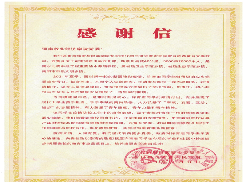 2021年9月3日,我校党委收到了一封特殊的信件,西簧乡党委政府向我校发来了一封感谢信。信中说到:“2021年夏季,面对新一轮的新冠肺炎疫情,许育宏同学能够积极响应乡党委政府号召,挺身而出,不顾个人安危得失,主动参与防控一线志愿服务,在值班值守、返乡人员信息摸排、疫苗接种等方面做出了突出贡献,用责任、初心和担当为全乡人民的健康安全构筑了一道坚实的防线。