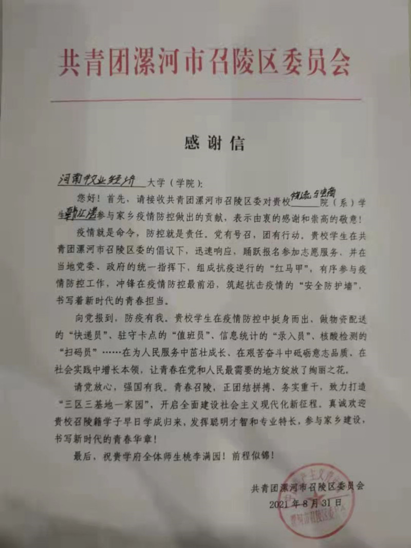 2021年8月31日我院团委收到一封河南省漯河市召陵区委员会的一封感谢信,信中提到williamhill英国19级韩汇港同学积极主动参与家乡疫情防控志愿活动,对韩汇港同学为抗疫做出的贡献表示由衷的感谢。