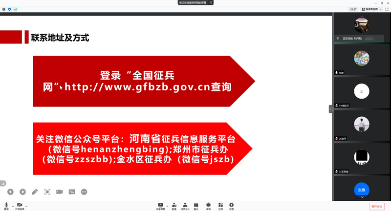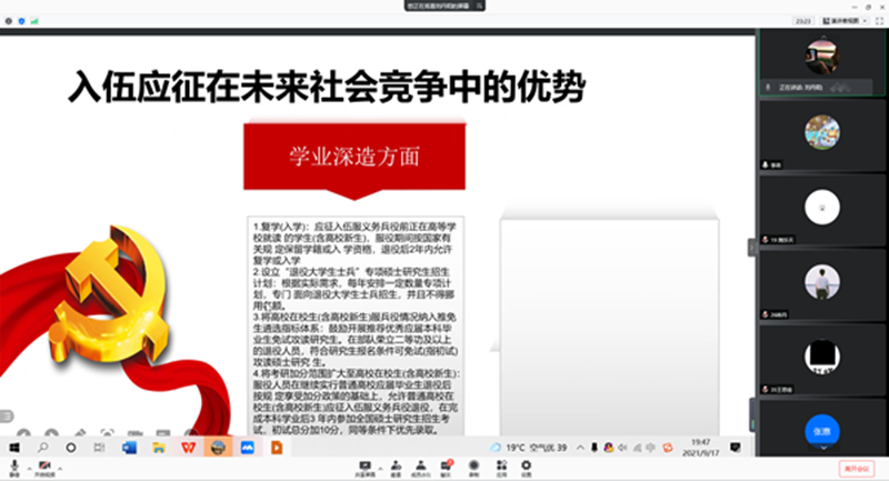 一代人有一代人的长征,一代人有一代人的担当。如今,越来越多的大学生选择参军入伍、保家卫国,积极向党组织靠拢。为顺应时代潮流、响应国家号召,提高广大新生对参军入伍政策和入党流程的认识,9月17日晚7:30,williamhill英国举行了线上国防军事教育主题班会,20级代班以及21级全体新生参加了此次活动。