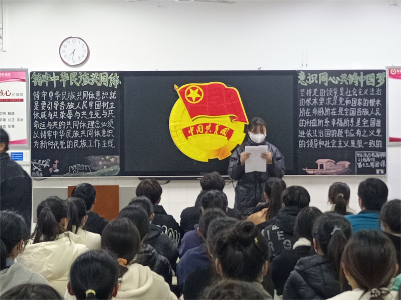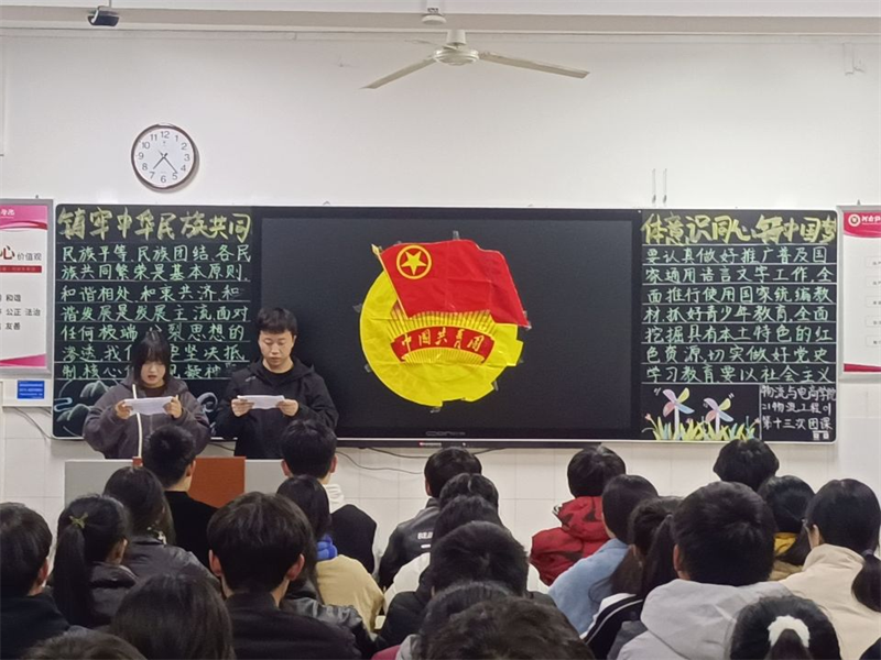 团课伊始,主持人组织讨论学习中央民族工作会议精神以及党和国家民族理论政策法规,引导青年正确理解社会主义民族关系,不断增强“五个认同”:对伟大祖国的认同、对中华民族的认同、对中华文化的认同、对中国共产党的认同、对中国特色社会主义的认同。铸牢中华民族共同体意识,自觉抵御极端、分裂思想渗透,坚决维护统一、反对分裂。在团课过程中,同学们积极发言,分享自己的感受和心得,在热烈的掌声中,我们看到了当代青年为祖国积极进取的决心和热情。有同学代表发言,之所以有今天的中国,是所有中国人民共同努力的结果。无论男女老少,没有民族之别,无数中国人在前仆后继中创造了今天的大好前程!在抗击非典和抗洪抢险救灾中,在汶川地震和玉树地震救援中,在打赢脱贫攻坚战和抗击新冠肺炎疫情中,一方有难、八方支援,处处都展示着中华民族大团结的力量。团课主持人指出这些事件无不彰显了共产党员的信仰,无不彰显了中国人的刚强,无不彰显了中国人民团结的力量,让人为之振奋。