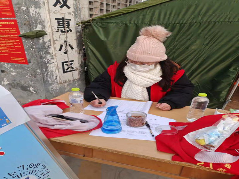 位于新乡市原阳县的20电子商务02班柴燕燕同学,在接到了社区志愿者招募的通知后,第一时间便报名加入其中。柴燕燕同学的志愿工作是在社区门口拉警戒线立告示牌,检查进入社区人员的健康码、行程卡。冬季的寒冷并不能影响她的工作,同时柴燕燕同学表示为了服务社区的人民群众她不会退缩,她将继续坚守岗位直至疫情结束。
