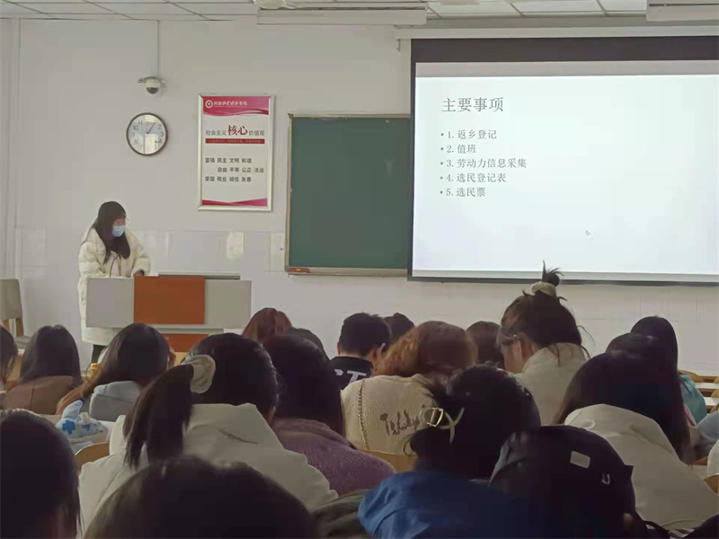 首先,老师让在寒假期间参与防控疫情的志愿者同学上台讲话,志愿者同学就在防控疫情期间如何协助医护人员工作和具体工作事项展开论述,台下的同学纷纷为他们鼓掌。接着,老师向台上的同学们提问有关感想,同学们积极发表自己的看法。随后,老师就返乡登记、值班、劳动力信息采集、选民登记表、选民票等事项进行阐述。最后,老师强调了校规校纪对同学们起着一定指导、管理作用,遵守校规校纪是每位学生分内的事,并希望同学们不管从班里还是自身角度,都要认真践行校规校纪,做一个有道德、有文化的学生。
