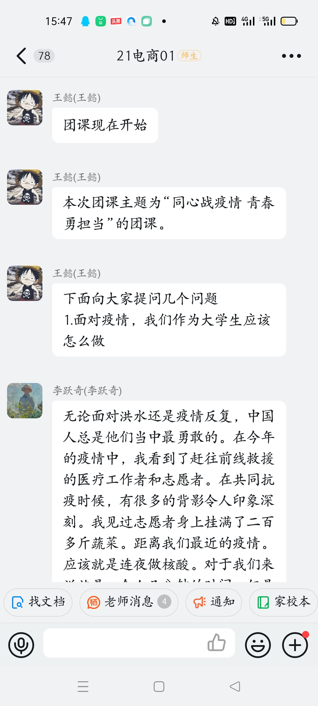 由于疫情防控,学校采取网上授课方式,因此本次团课在宿舍以网课形式进行,由各班团支书主持,统筹安排、积极组织和策划,为同学们整理了贴近实际的防疫知识,同学们在宿舍做好团课准备。团课开始,首先由团支书向大家介绍团课召开的背景,紧接着,同学们进行踊跃发言,纷纷谈到在疫情防控的形势下要自觉按照科学指引做好个人防护,不传谣,为疫情防控作出实实在在的贡献,并充分利用这段时间,在宿舍自我充电提升,全方位提升自身的综合能力,为后期的学习筑牢基础,通过本次团课,能够帮助同学们深刻认识到疫情防控是我校现阶段工作任务的重中之重,能够帮助同学们正确认识到疫情防控形势,让同学们在疫情防控中整理好心情,以积极的心态面对疫情管控。