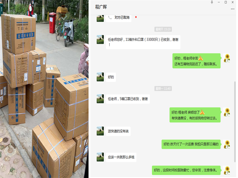 在得知学校防控物资消耗巨大,物资紧张的情况下,任佳佳老师和妻子张朦朦老师多方联系,第一时间购买16箱共计4.8万支口罩捐赠给学校,用爱心为学校筑牢疫情防控战线贡献力量。