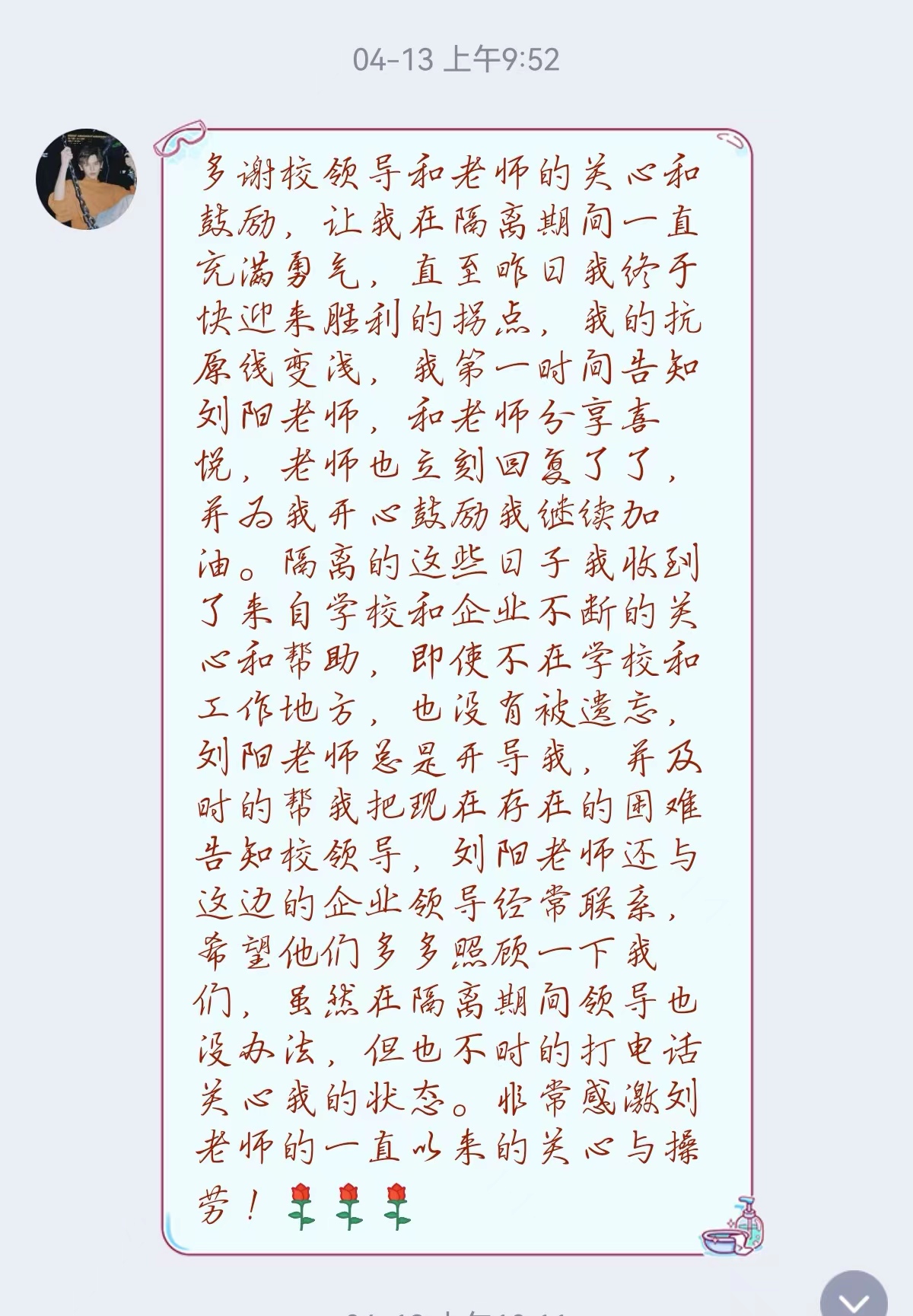 艰难方显勇毅,磨砺始得玉成。所有困难与付出的背后,都是润物无声般的世间大爱。疫情期间,那些无声的陪伴与奉献,早已在学生们的心中谱下了一首首温暖乐章,那些付出后收获的一句句感谢与安慰,也让所有的疲惫烟消云散,刘阳老师与学生都成为了照亮温暖彼此的星光。