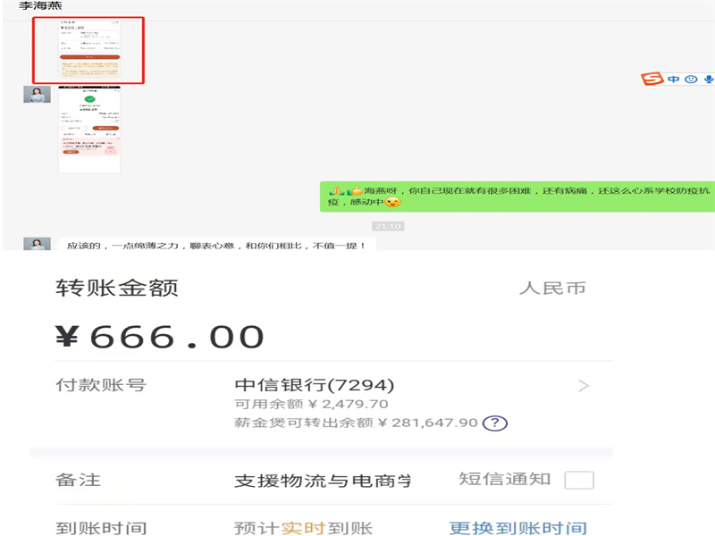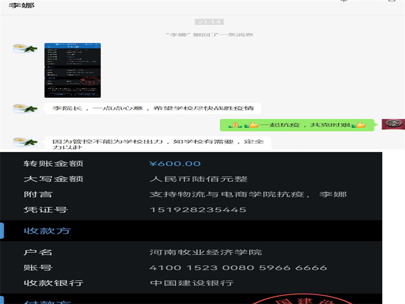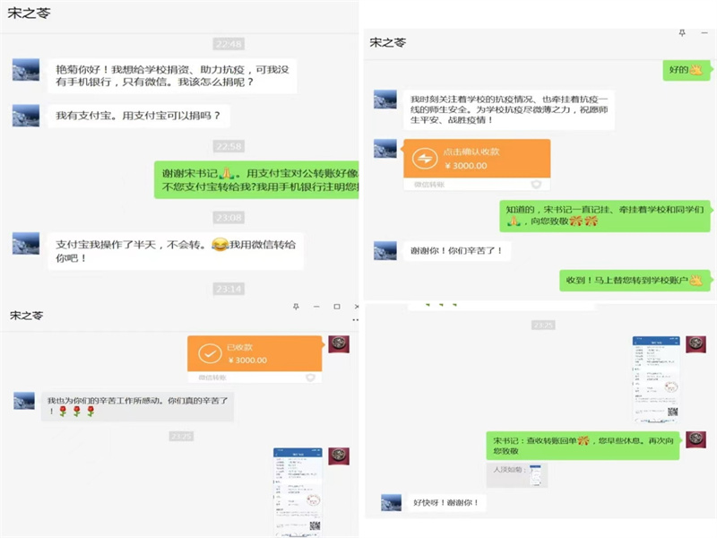 当得知我校疫情形势严峻,防疫物资短缺时,我院几名教师立即伸出援助之手。“我时刻关注着学校的抗疫情况,也牵挂着抗疫一线的师生安全,为学校抗疫尽微薄之力,祝愿师生平安,战胜疫情。”学院组织员宋之苓书记捐款时动情地说;任佳佳老师、张朦朦老师得知学校疫情防控形势后,第一时间共同为我院捐赠近五万只外科口罩;前段时间一直饱受病痛折磨的李海燕老师看到学校有困难,毫不犹豫为校捐款;而处于疫情管控区的李娜老师也时刻关注学校动态,即使不能在学校与全校师生携手抗疫,也仍以捐款的方式为学校尽自己的一份力量;他们纷纷表示,祝愿学校早日战胜疫情,希望能够尽快见到同学们,而为抗击疫情默默奉献的领导老师、志愿者们都辛苦了!