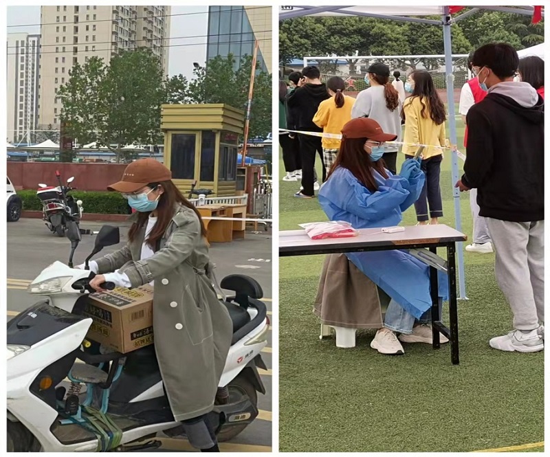 物资难求,箱箱珍贵。当防疫物资抵达学校后,学院立即组织在校教师搬运货物。杨老师变身“配送员”,骑着电动车主动帮助学生搬运配送物资进宿舍,用不太宽厚的肩膀撑起属于自己的责任和担当。杨老师化身核酸扫码志愿者,认真完成核酸扫码工作,协助医护人员做好核酸采样工作。用心用情、无怨无悔担负起学校在特殊时期的特殊职责。