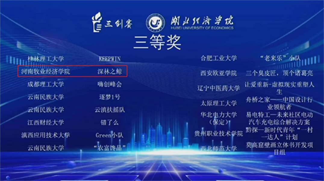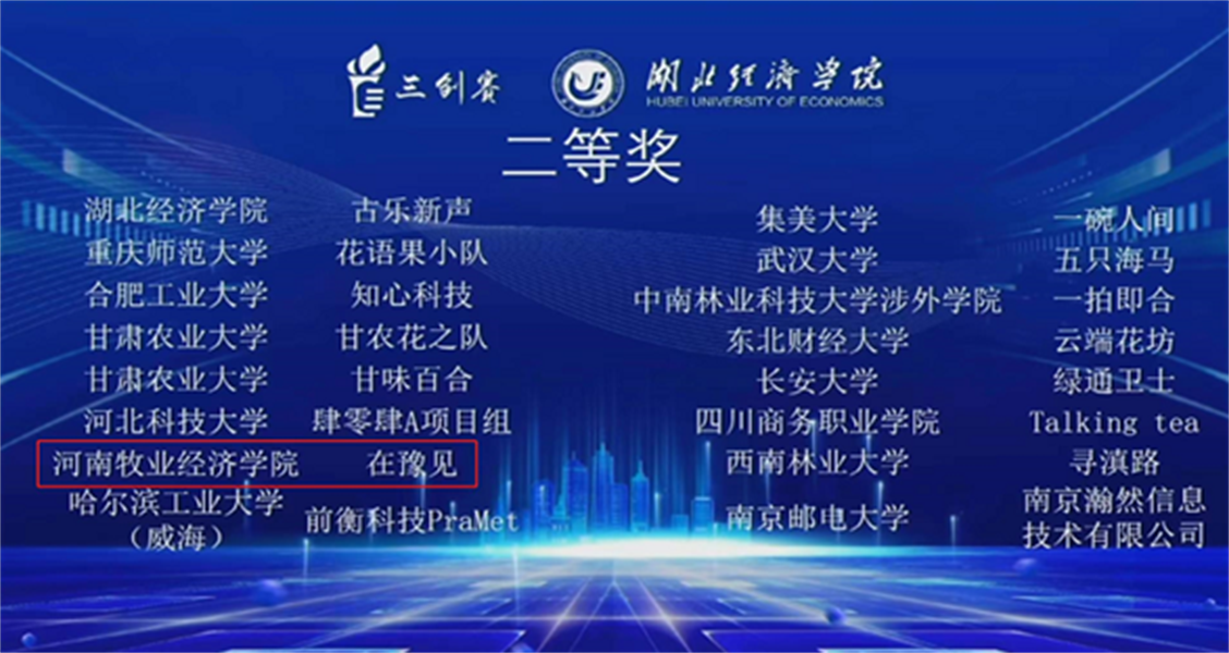 经过分组赛、终极PK赛的激烈角逐,最终由毕勋勋、李家锌、王聚源、魏思甜四位同学组成的豫小团团队参赛的《豫小团戏曲文化在线传播平台》项目获得了国赛二等奖;由周为、张梦瑶、张冰、王慧鑫、张宇隆五位同学组成的深林之鲸团队参赛的《“身临其境”5G背景下的VR内容服务平台》获得了国赛三等奖。