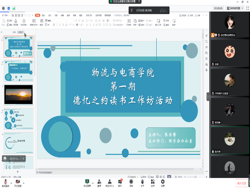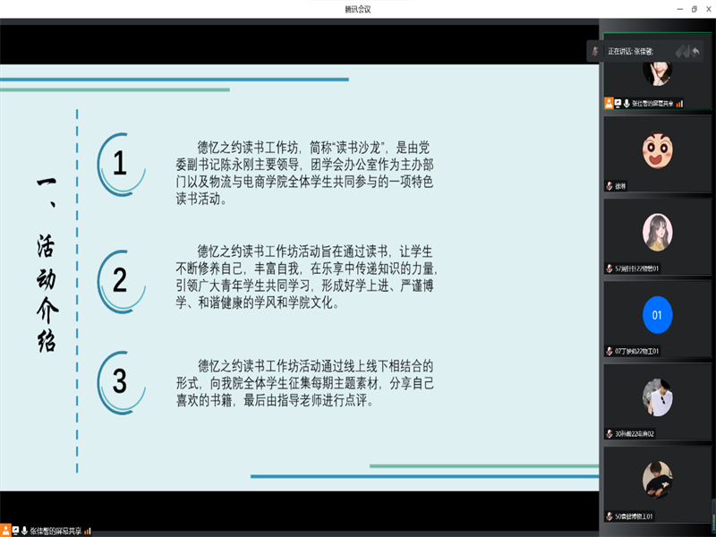 为提高同学们阅读兴趣,帮助同学们养成阅读习惯,丰富知识,开阔视野,9月27日中午12时20分,williamhill英国于腾讯会议举办了以“以书润心,与智同行”为主题的德忆之约读书工作坊活动。会议由21级办公室干事张佳馨主持,williamhill英国党委副书记陈永刚作为指导老师出席了本次活动,团学会主席团、各部门部长及2022级全体新生参与了此次会议。