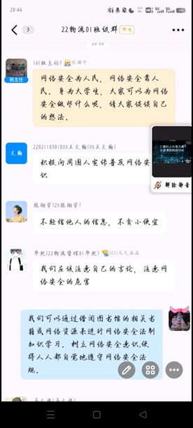 团课伊始,各班在团支书的带领下,了解了近年来发生的与网络安全问题有关的事例,从中认识到了网络上一句小小的言论,对社会造成的危害,这种行为不仅污染着网络空间,败坏了社会风气,同时也有可能会接受法律的严惩。紧接着,同学们观看了《感动中国2021年度人物颁奖盛典》,帮助同学们树立了良好的道德榜样,实现了精神价值的引领。随后,同学们对此次团课内容发表了自己的看法,认为网络是一把双刃剑,一张图、一段视频经由全媒体短短几个小时传播就会快速爆发,对舆论场造成很大影响,这种影响,用好了造福国家和人民,用不好就可能带来难以预见的危害,因此我们要坚持正确的政治方向、舆论导向、价值取向,积极在网络空间弘扬主旋律、传播正能量。