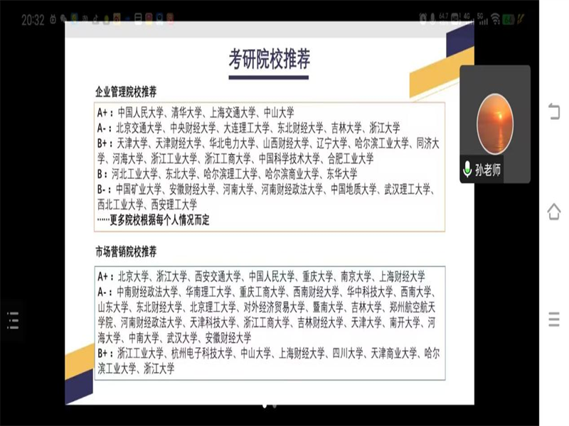 讲座伊始,孙老师根据疫情期间考研人数及录取比例的基本情况对当前考研形势进行举例分析,引入主题。随后孙老师从专业就业前景,学硕/专硕选择,跨专业推荐,考研院校的选择四个方面来为同学们进行考研指导,主要以电子商务与物流管理两个专业来为同学们开展讲解,首先指出两个专业的考研方向,电子商务的考研方向为:国际商务,企业管理,管理科学与工程等;物流管理的考研方向为:管理科学与工程,企业管理,物流工程等。接下来,孙老师向同学们介绍了电子商务和物流管理这两个专业的就业方向与前景,电子商务可以以电子商务网站设计,电子商务平台美术设计等为就业方向,物流管理可以以企业物流,国际物流管理等为就业方向。最后,孙老师结合电子商务和物流管理这两个专业的需求,向同学们推荐了一些不同等级的考研院校。在会议接近尾声的时候,孙老师向同学们全面的讲述了考研的意义和就业前景,激发了我院同学的考研热情,让同学们坚定了考研信心,并向同学们提出了一些考研需具备的要素:科学的备考计划,充足的学习时间,合理的报考方案,要全力以赴,要有针对性。