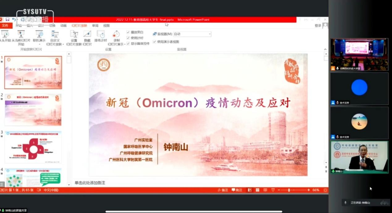 为使同学们更好地适应疫情防控政策的调整,以及了解疫情的新形势、新变化和新特点,12月15日15时williamhill英国组织全体师生线上观看全国高校抗疫大讲堂之《新冠(Omicron)疫情动态及应对》,主讲人为中国工程院院士钟南山。