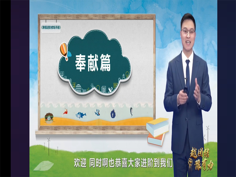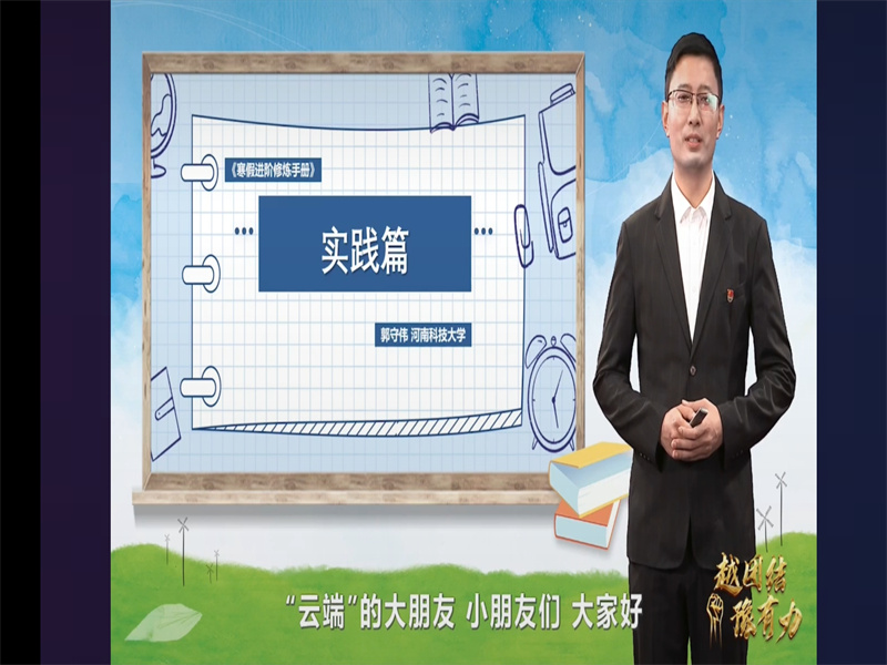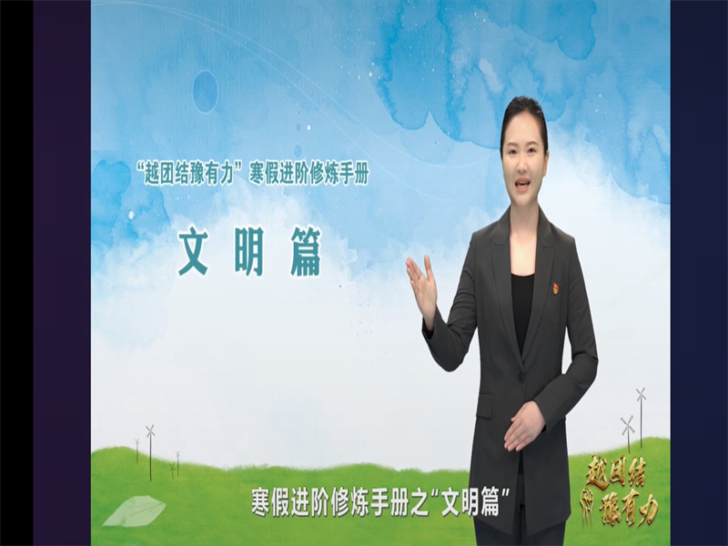 本次直播分为五篇,旨在帮助同学们逐步深入学习“寒假进阶修炼手册”,学会寒假居家如何健康生活、学习。第一篇——“责任篇”,由商丘师范学院团委书记刘培培老师主讲,首先,刘老师告诫同学们:要保持良好的心态,做自己和家人健康的守护者,谨记习近平总书记在党的二十大报告中对新时代青年的殷切期望,承担起青少年应有的责任;接着,刘老师给同学们讲道:科学防疫不松懈,要在家务劳动中体悟民俗文化,要常记开窗通风、清洁消毒,积极响应“清洁与卫生、整理与收纳、烹饪与营养、家用器具使用与维护。”四项劳动课程标准;最后,针对大学生陆续返乡问题,刘老师讲道:青年挺膺显担当,假期返乡要积极投身社会实践;第二篇——“文明篇”,由河南理工大学辅导员刘小梅老师主讲,刘老师分了“是什么?”和“怎么做?”两方面帮助了同学们学习了“践行文明,从我做起”,深刻而富有意义;第三篇——“自强篇”,由郑州大学机械与动力工程学院团委书记任怡老师主讲,任老师提出了如何度过快乐和充实假期的方法:可以和同学朋友们聚会、和家人去旅行,除此之外,还有个非常好的选择,那就是读书,通过读书来陶冶自己的情操,放松自己的身心,实现在假期里的自强;第四篇——“实践篇”,由河南科技大学医学技术与工程学院学工办主任郭守伟老师主讲,郭老师言简意赅,告诉了同学们:要想深入了解事物的道理,就要亲身去实践,“纸上得来终觉浅,绝知此事要躬行”,实践非常重要。另外,郭老师还提醒了同学们:寒假期间同学们有丰富的实践机会,要珍惜这个寒假,利用实践来提升自己。第五篇——“奉献篇”,由郑州航空工业管理学院辅导员何迎亚老师主讲,告诉同学们要学会奉献社会,让青春在党和人民最需要的地方绽放绚丽之花。