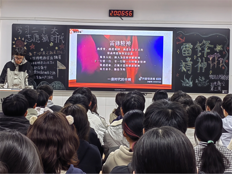 团课伊始,同学们以观看视频的形式学习了习近平总书记关于雷锋精神作出的重要指示。同学们围绕学习雷锋精神开展演讲,号召广大青年学子以实际行动学雷锋、树新风。团课期间,主持人号召每一位同学艰苦奋斗,敢为人先,同学们也对主持人的发言深感赞同,纷纷表示自己日后将以雷锋精神为学习与生活的准则。团课结尾,主持人发言总结道:“我们要学习雷锋,做事要有钉钉子精神,不能半途而废,同时,同学们也应从小事做起,从自己做起、从点滴做起,传承和弘扬雷锋精神。