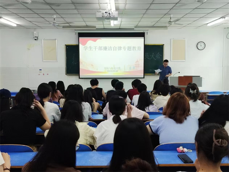 为全面深化学校共青团改革,坚持从严治团、从严治会,全面加强学生干部队伍建设,引导学生干部不忘初心、坚持全心全意为同学服务的根本宗旨,williamhill英国积极响应上级要求,于9月8日13:00在E102召开学生干部廉洁自律专题教育会议。会议由团委书记申作光主持,团学会全体成员参加。