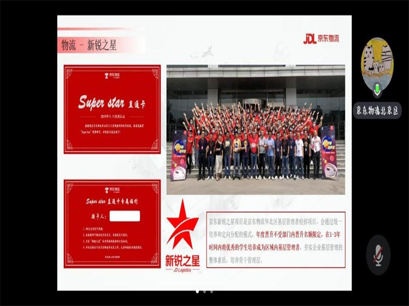 会议伊始,京东物流华北区招聘负责人刘老师通过PPT的形式向简单介绍了京东物流华北区的基本情况,让同学们对公司有了初步的了解。接着又详细讲解了京东物流的发展历程、企业理念,以及人才的培养模式和福利待遇等。本次招聘岗位主要负责收货、理货、复核、拣货、上架、打包、分拣等职能,综合工资4000-7500元/月(上不封顶),实习地点随机分配,主要在北京、天津、河北等地。京东集团对于员工实行学徒管理制,为员工提供最佳的发展平台,除此之外,福利待遇十分优厚,其中包括全勤餐补、免费住宿、夜班补贴和五险一金等,并且会正式签订劳动合同,缴纳国家规定的福利政策。最后,刘老师针对同学们提出的疑问进行解答,并动员有意向的同学扫码进群,后续将会安排面试。