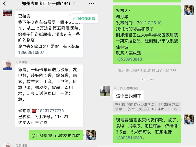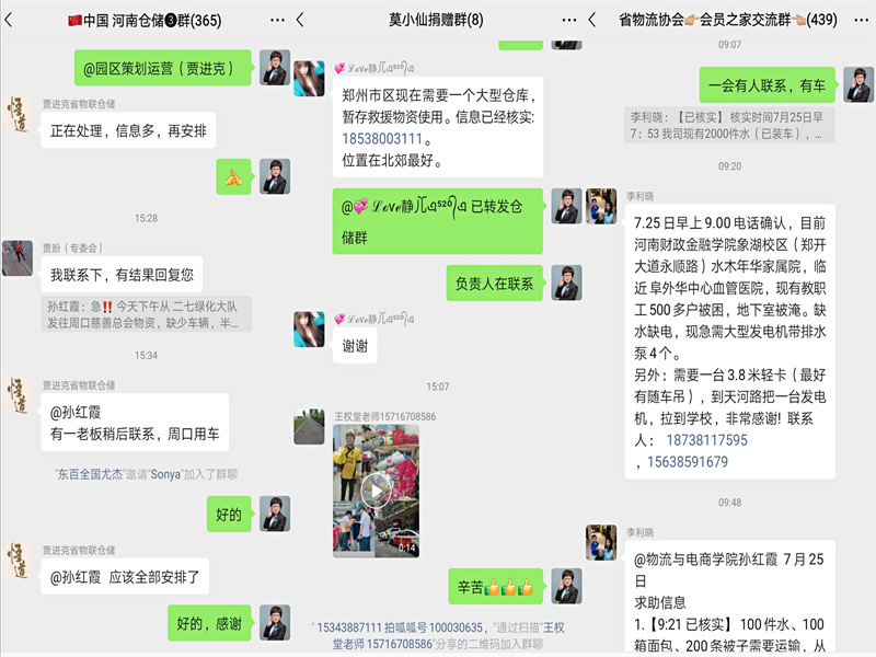 洪灾前,李利晓老师和孩子就已身在外地,看到郑州受灾,朋友圈和微信群里发的洪灾信息,却帮不上忙,心痛不已。当她了解到自己的老师能够对接物资车,就及时将需要运输车的消息转发给了河南省物流协会的秘书长李霞,由她转发至群中。就这样许多信息很快对接成功,李老师非常开心,立刻向群中分享能够对接救灾物资运输车的消息。同时,李利晓老师还加入了郑州市惠济志愿者群、同学组织的捐赠队群、物流协会群、冷链抗灾工作物流群等等。她表示,每当大家有需求,将信息发至群中或私聊她时,她都很热心帮助每一位求助者。李老师说:“咱们物流人有大爱,都能快速对接成功,把物资及时准确地送达目的地。尤其有一车医疗物资,负责人能够在群里自动对接到一辆冷藏车,专业又高效”。虽然李老师因火车停运无法归家,但她的爱心和热情已经传递在灾区的数个角落。
