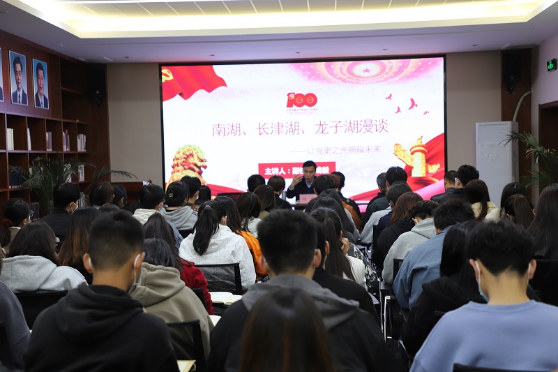 党史学习教育启动以来,学校领导班子成员围绕党史学习,结合工作实际,着眼发展新局,面向师生讲授思想深刻、富有实践指导意义的党史学习教育思政课。为把学习党史同深刻领悟习近平新时代中国特色社会主义思想贯通起来,10月21日下午3时,姚毅校长以“南湖、长津湖、龙子湖漫谈——让党史之光照耀未来”为题,在图书馆一楼会议室为williamhill英国师生讲授了一堂有高度、有深度、有情怀、有温度的党史学习教育思政课。williamhill英国党委副书记陈永刚、团委副书记王雪冰、全体辅导员及部分学生干部参加。