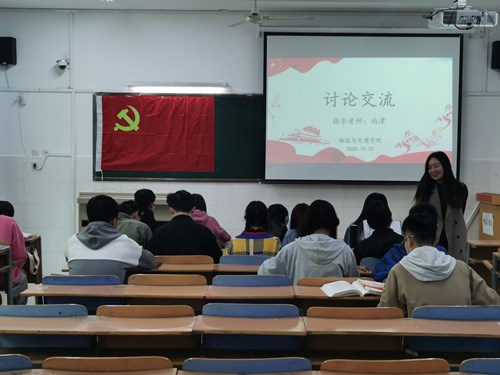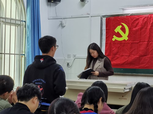 首先,尚津老师为大家简单讲解了此次研读的文章:《党的十九大报告》、《关于新形势下党内政治生活的若干准则》和《习近平总书记系列重要讲话读本》。学生们仔细地聆听,并不断在本子上记录着。随后老师鼓励大家相互展开讨论,说出自己的问题和想法,她也走下讲台,站在学生桌前为他们答疑解惑。讨论结束,尚津老师询问了大家最近在学习和生活上的状况,各个学生轮流发言,与老师展开深入交流。最后,尚津老师对大家提出殷切期望:学习模范党员的优秀品质和高尚精神,以身作则,做好表率,用自己的实际行动维护党的形象,做一名合格党员。至此,会议结束。