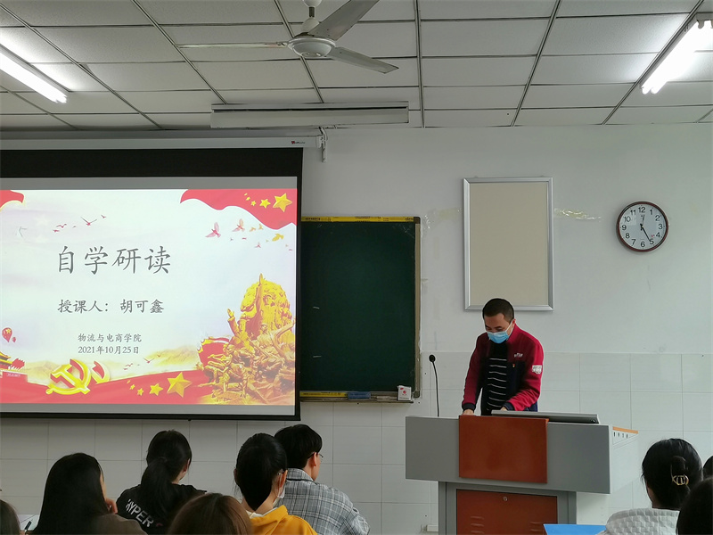 为了提高入党积极分子的自主学习能力、深入理解能力以及与实践相结合的能力,将党史学习深入到学生生活当中,我院2021年第二期入党积极分子党课自学研读专题于10月25日12时在E102教室开展。辅导员胡可鑫作为指导老师出席党课,对如何进行党史文件的自学研读提出了要求。