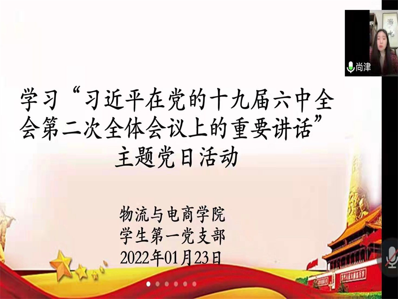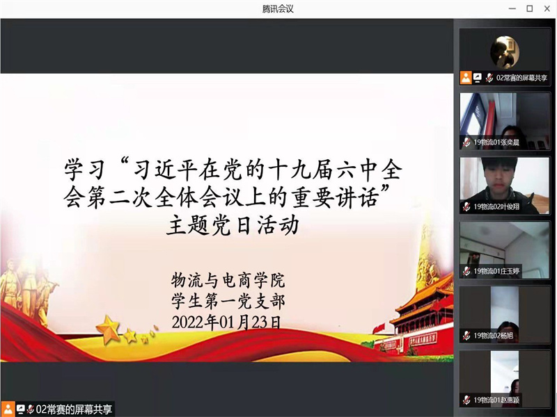 为巩固好党史学习教育的成果,williamhill英国学生第一党支部于1月23日下午17:00通过腾讯会议在线上开展了以“习近平在党的十九届六中全会第二次全体会议上的重要讲话”为学习内容的的主题党日活动,学生第一党支部书记尚津、第一党小组组长王雪冰和全体在校学生党员参与此次会议。
