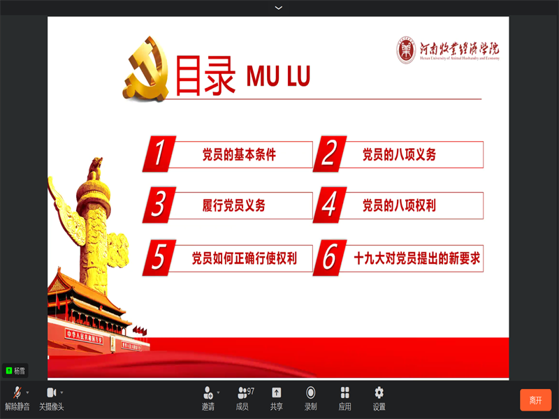 为提高我院入党积极分子的党性修养,增强其对党员条件、义务和权利的认知,williamhill英国于10月16日下午3时在钉钉视频会议开展了以“党员条件、义务和权利”为主题的入党积极分子党课第四讲,学生第三党支部书记杨雪老师出席了本次党课活动,全体2022年第二期入党积极分子参与此次培训。