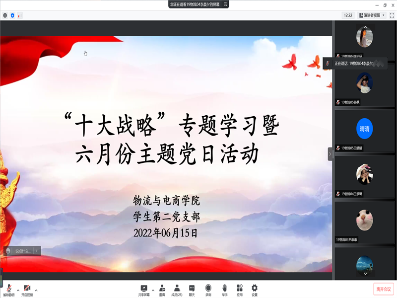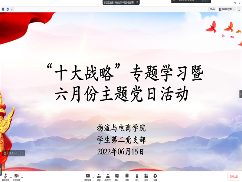 按照校党委《关于组织党员进党校学习“十大战略”的通知》校党【2022】22号文件及《关于开展2022年6月份党支部主题党日活动的通知》的要求,结合“能力作风建设年”活动的开展,williamhill英国学生第二党支部于6月15日11时在线上通过腾讯会议召开了“十大战略”专题学习暨六月份主题党日活动。学生第二党支部书记刘阳老师、组织委员张排杰老师,党小组长杨奇奇老师及学生第二党支部19级在校生党员出席此次会议。