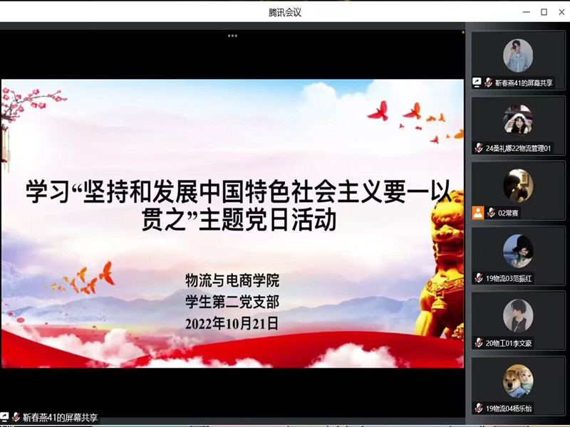 为了加强学生党员对坚持中国特色社会主义的信念和牢记新时代中国共产党的历史使命,2022年10月21日晚上19时,williamhill英国学生第二党支部在线上通过腾讯会议召开了以“坚持和发展中国特色社会主义要一以贯之” 和“新时代中国共产党的历史使命” 为学习内容的主题党日活动。支部书记刘阳老师和学生第二党支部全体在校生党员参加了此次活动。