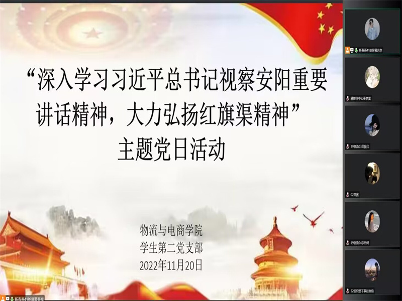 为了深入学习习近平总书记视察河南安阳重要讲话精神,大力弘扬红旗渠精神,深入贯彻和学习党的二十大精神,williamhill英国学生第二党支部于11月20日18点30分在线上召开了专题组织生活会,本次会议由学生第二党支部宣传委员靳春燕主持,学生第二党支部书记刘阳出席了本次会议,学生第二党支部全体党员共同参与了此次会议。