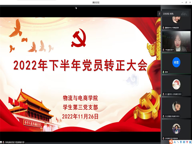 为了进一步完善党员发展工作,增强党员队伍的生机与活力,提高党员素质水平,强化党员管理,在遵循疫情防控的前提下,williamhill英国学生第三党支部于2022年11月26日晚八点,在腾讯会议召开2022年下半年党员转正大会。学生第三党支部书记杨雪出席了本次会议,本次会议到会党员共57名,其中正式党员12名,预备党员45名,新发展正式党员33名。