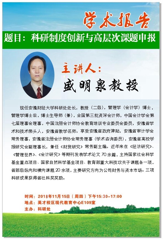 为提升我校教师开展科学研究的能力和水平,营造良好的科研学术氛围,学校特邀安徽财经大学科研处处长盛明泉教授做《科研制度创新与高层次课题申报》的专题报告。具体安排如下: