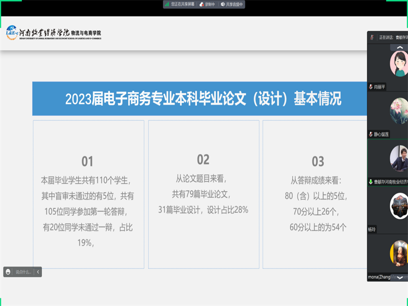 会议中,李娜老师就教育部论文抽查情况以及2023届电子商务专业本科毕业论文(设计)基本情况进行了汇报。论文答辩组长殷猛博士和肖丽平博士分别就论文答辩环节中存在的问题进行了分析,并提出了合理化建议。会议上其他各位指导教师分别从选题、论文辅导、撰写、盲审等环节进行了讨论。指导老师一致同意毕业论文(设计)指导过程中在内容上导师要多注意,要严格把关摘要和结论的写作,同时导师要把关文献的质量、数据的获取、排版及格式等。