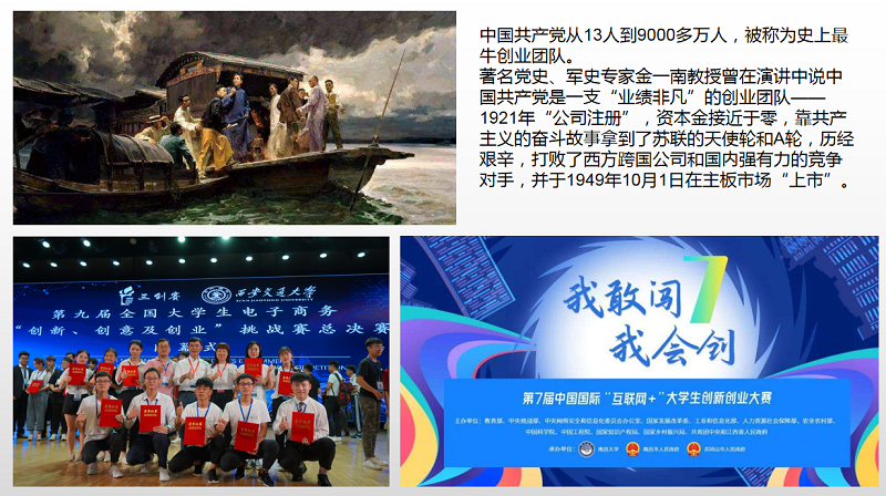 李艳菊教授在《电子商务概论》的绪论课中为了引导学生们积极备赛电子商务“创新、创意及创业”挑战赛、互联网+大学生创新创业大赛等学科竞赛,巧妙的将“史上最牛创业团队——中国共产党”从无到有、从小到大、从弱到强的“创新创业历程”与大学生创业意识激发、创新精神培养、创新创业能力锤炼等方面有机结合,帮助学生进一步丰富了知识体系、扩大了知识范围、提升眼界,树立和坚持了正确的党史观,培养了学生创造性解决问题的能力和思维。