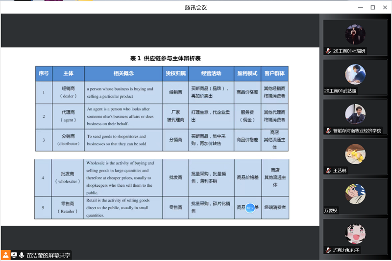苗洁莹老师本次交流课的授课对象为20工商管理01的同学。苗洁莹老师在课前提前向同学们发放学习资料以及课堂互动活动(“我问你答我来说”游戏)规则,同时在学习通平台上进行相关资料的上传,安排课前预习、收集和分析资料等任务。在课堂开始时,苗老师通过腾讯会议截图进行考勤,保证了课堂100%的出勤率。接下来,同学们分十组进行游戏,游戏规则为双号组指派代表向单号组提问问题,单号组指派代表回答问题,之后双号组另指派代表总结并回答最终问题。“我问你答我来说”的游戏不仅充分调动了学生线上学习的积极性,同时,通过章节五大模块对应的五个有逻辑系列的问题配对问答方式,引导学生自己总结出理论的核心内容,激发学生的自主自发地学习思辨能力以及发现问题、分析问题、解决问题的能力。苗老师设计的课程主题为供应链运作协调管理,按照发现问题、分析问题、解决问题的逻辑思维分为供应链失调问题障碍因素、牛鞭效应、曲棍球棒效应、双重边际效应、供应契约的分析五大模块,期间巧妙融入课堂思政元素,学教并重。在课程最后,苗老师通过手机游戏(啤酒游戏)的布置,引导学生自己通过手机游戏的方式验证供应链运作协调管理。苗老师的课堂讲授准备充分,内容丰富,课件精美,思路清晰,师生积极参与线上互动,能够启发和鼓励学生思考,同时又充分体现了授课教师自身的鲜明特点,充分展示了我院优秀青年教师的教学风采。