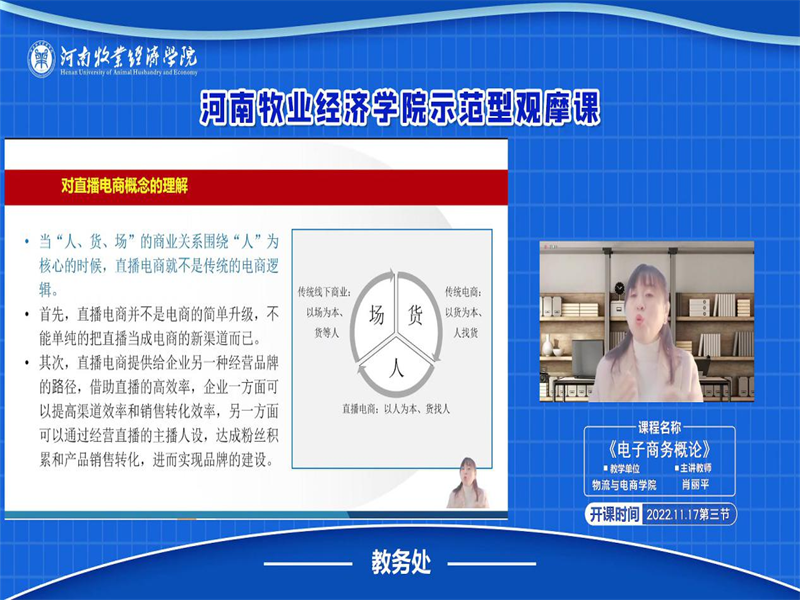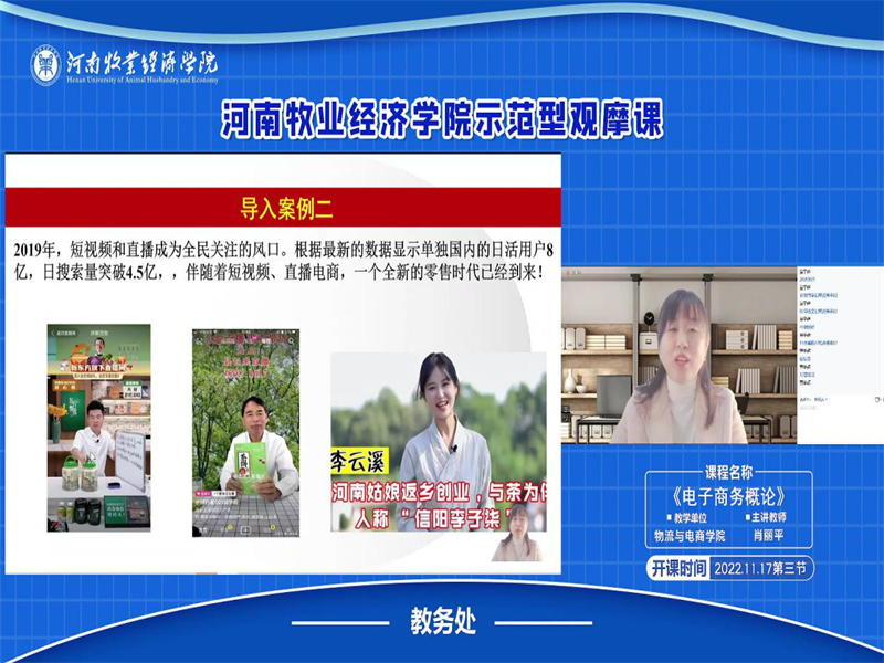 为了进一步提高本科课堂教学质量,推广先进的课堂教学理念,根据《英国威廉集团关于组织开展第八届课堂教学观摩活动的通知》及《英国威廉集团关于开展“课堂教学质量提升年专项行动”的工作通知》要求,学院扎实开展了本学期课堂教学观摩活动。11月17日上午,我院电子商务教研室肖丽平副教授开展了《电子商务概论》课程的线上示范型型教学观摩活动,我院部分领导及教师参加了观摩活动。